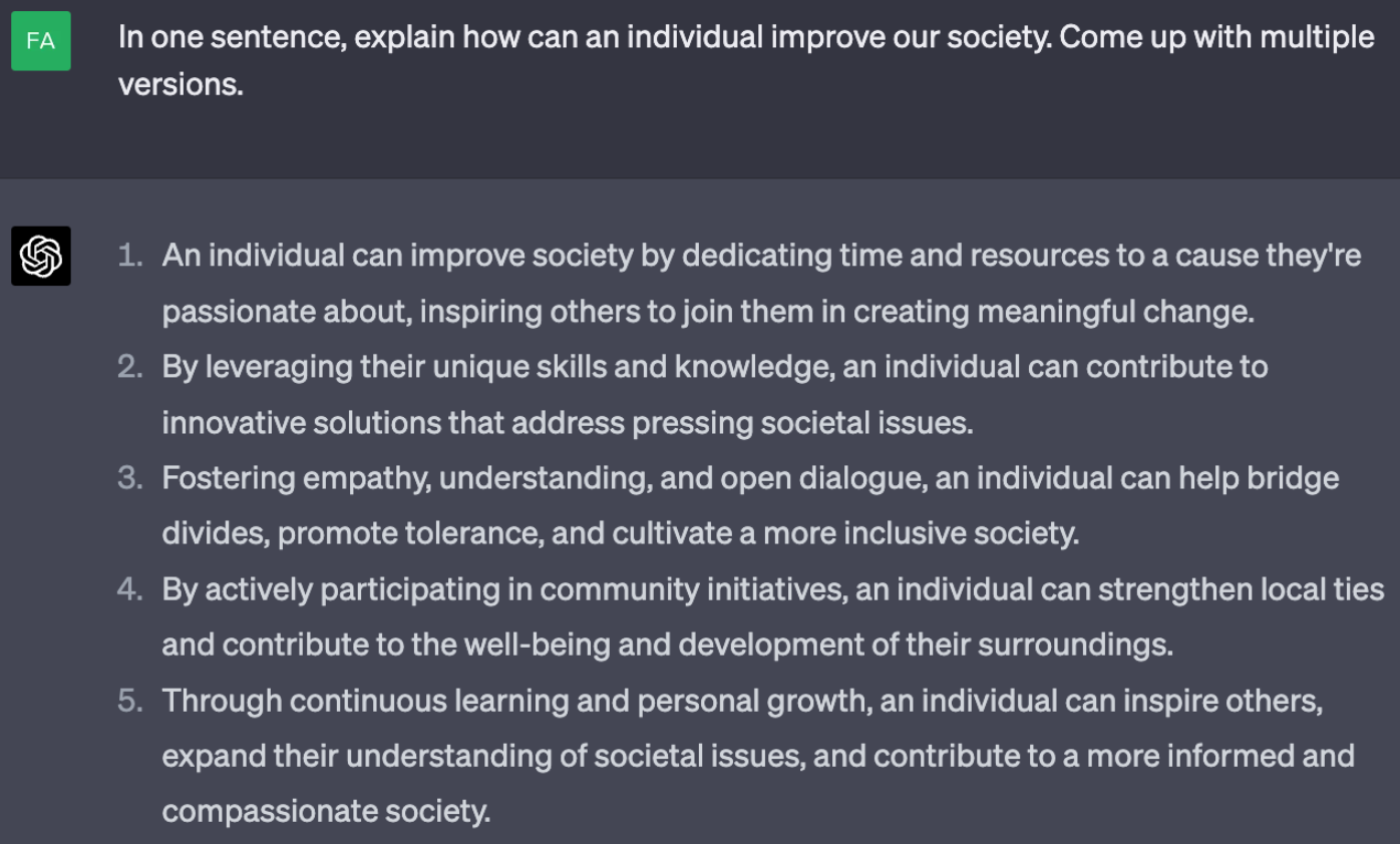 Without any surprises, it generated a list of conventional answers that seemed correct, but vague. You would still be very confused and don't know what exactly one can do to improve our society.