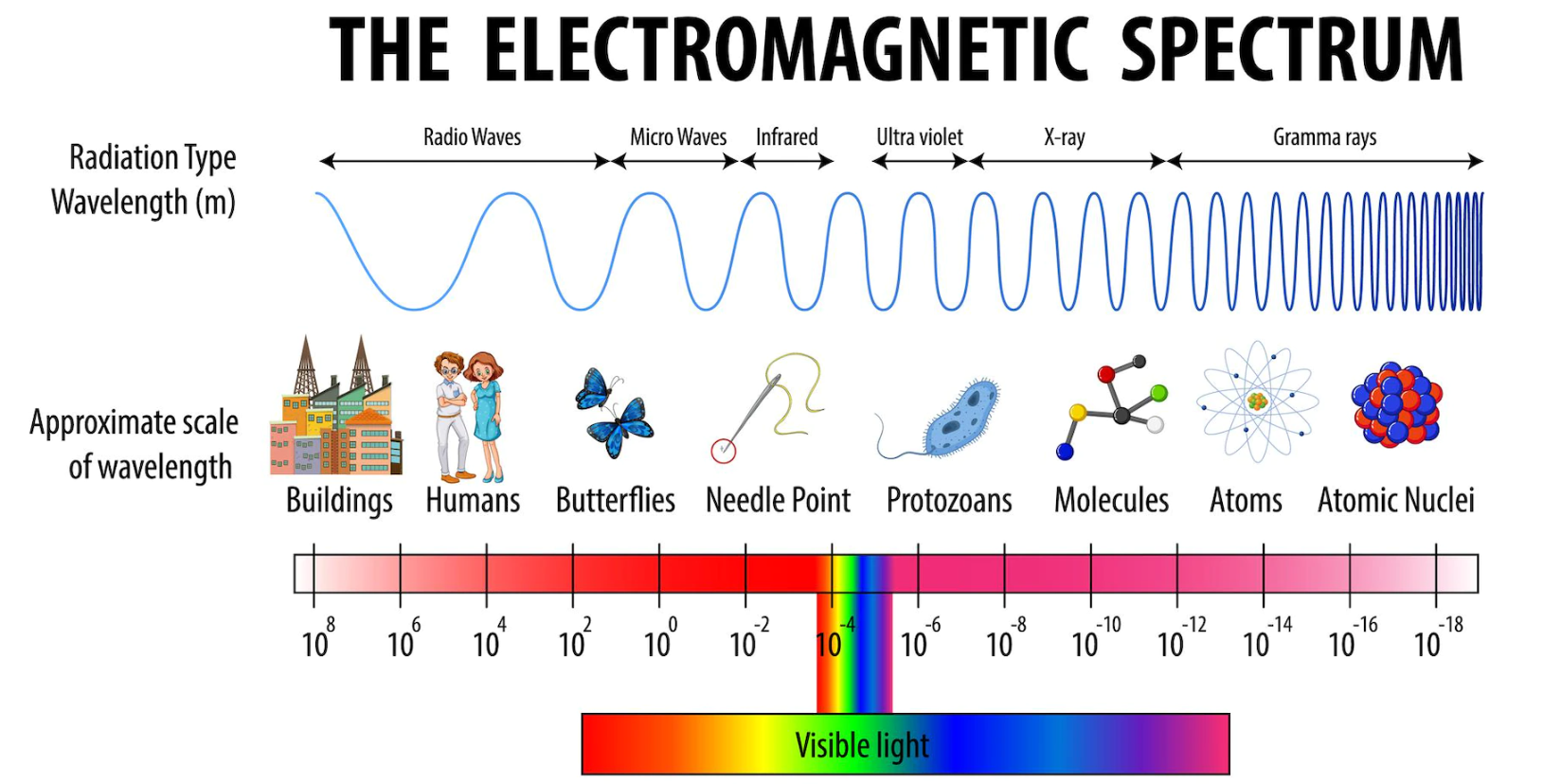 Let's do a quick overview of the electromagnetic spectrum! As shown in the below image, there are seven types of light (or seven forms of electromagnetic radiation). Our human eyes can only see the light in the visible light spectrum.