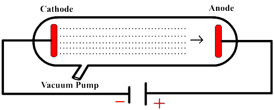 It had been known for several decades in the late nineteenth century that when a high voltage was connected to the tube, so-called cathode rays would flow from the negative electrode (the cathode) towards the positive electrode (the anode), creating an eerie green glow where they hit the end of the tube. Check the images below.